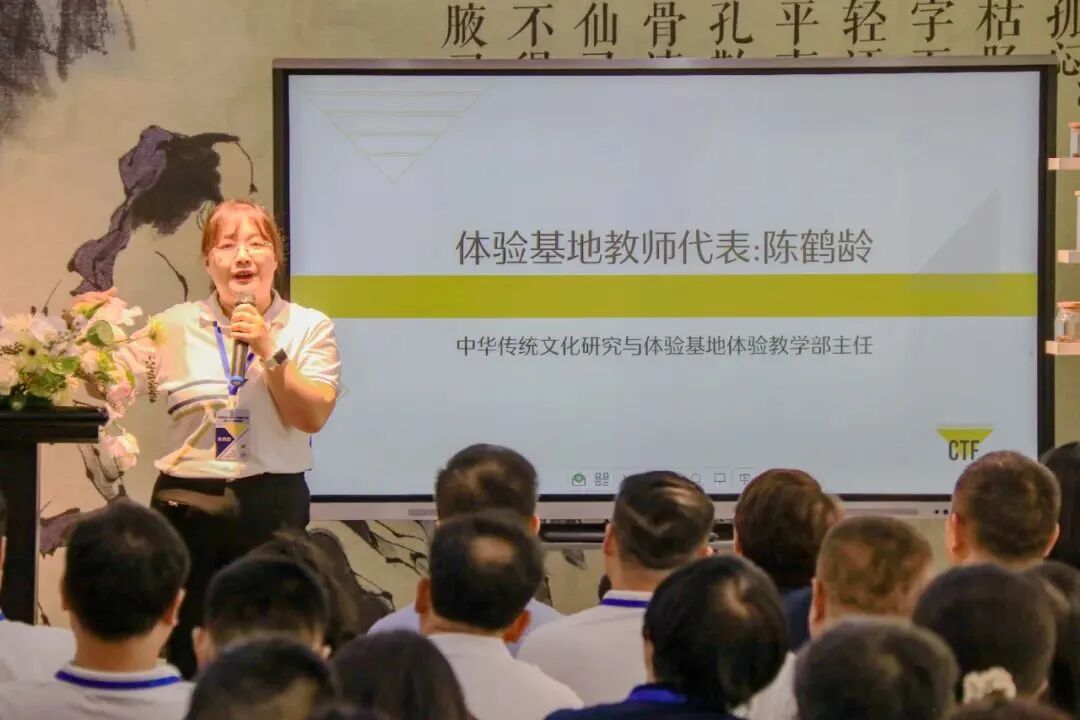 山东大学中华传统文化研究与体验基地体验教学部主任陈鹤龄代表教师团队发言。她表示,基地教学目标是唤醒年轻人对传统文化传承的责任感。随后陈老师讲述了两段自己在教学中将中华优秀传统文化的种子埋入国内外青少年心中的小故事,希望将“微微风簇浪,散作满河星”的满河星化作满天星,吸引更多人热爱中华优秀传统文化。