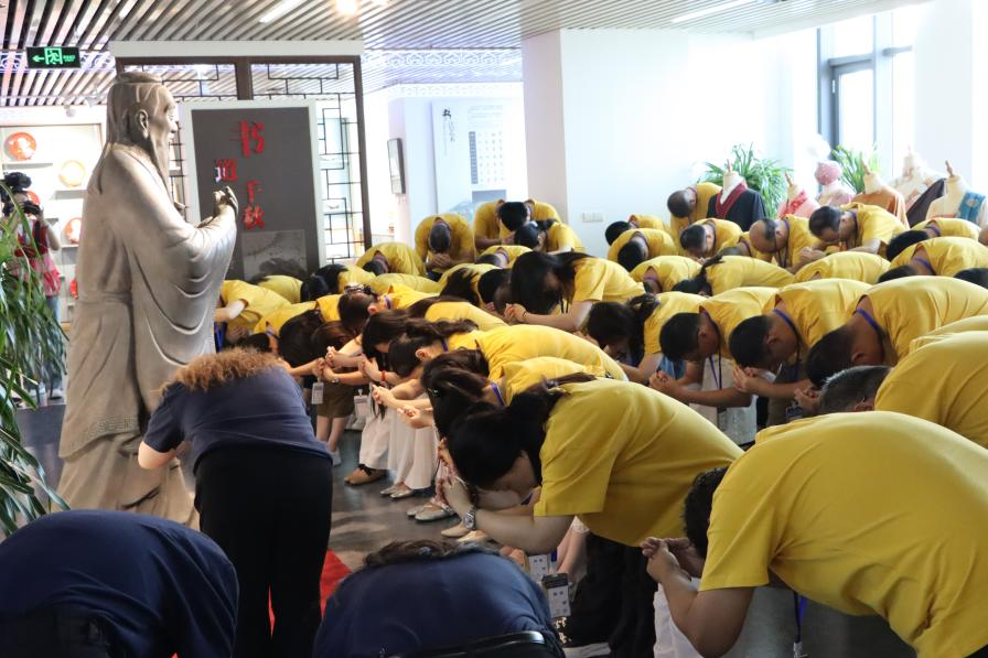 开班仪式设置拜师礼环节。陈鹤龄带领全体学员面向孔子像行传统拜师礼,三拜三兴,躬身行礼间,既是对先贤的尊崇,也是自我的反躬自省。