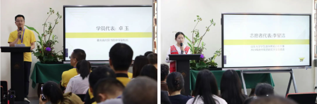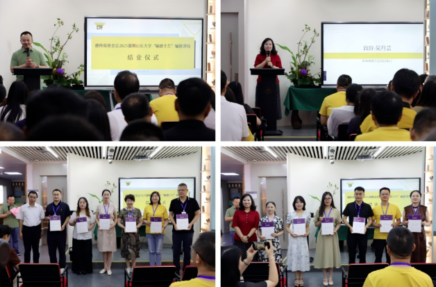 仪式伊始,全体人员一同观看了课程的精彩集锦视频。唐仲英基金会项目执行吴丹芸女士发言,她对前来的各位领导、老师、学员及志愿者们表达了诚挚感谢,她表示项目的顺利推进离不开各方支持与参与;同时也期待与山东大学深化合作,依托双方优势,共同为文化教育事业发展注入更多活力。之后,常世旺与吴丹芸一同为学员们颁发了结业证书。