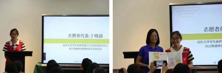 山东大学学生唐仲英爱心社活动实践部部长、2022年唐仲英德育奖学金获得者于晓涵作为志愿者代表发言,分享了此次志愿服务的感受以及将公益精神践行到底的决心。于勤老师向志愿者们赠送了学员们一起制作的爱心留言册,字字句句表达着学员们对志愿者们辛勤付出的衷心感谢。