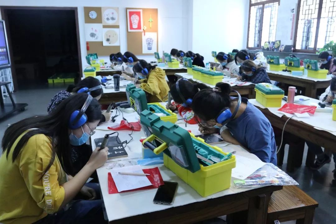 在非物质文化遗产继承人单孟渤老师的指导下,同学们从传统雕刻学起,利用刻刀和瓷盘,创作出了自己的第一件文创作品。天马行空,思想初开,同学们的作品充满了艺术感染力。