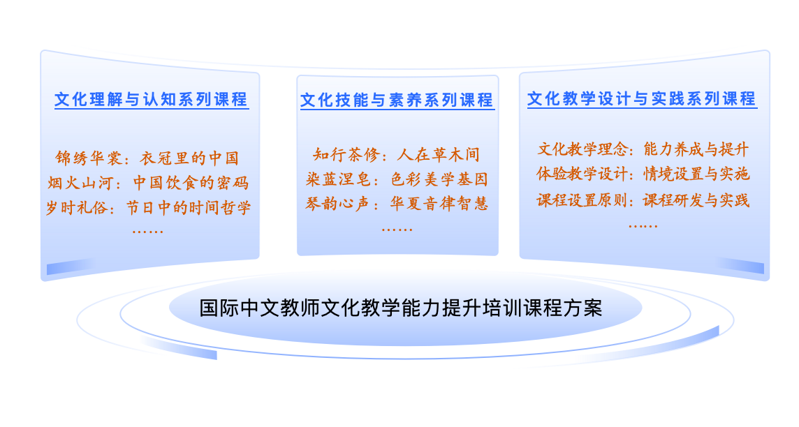 本项目课程以体验为特色,形成了文化理解与认知系列课程、文化技能与素养系列课程,以及教学设计与实践系列课程。