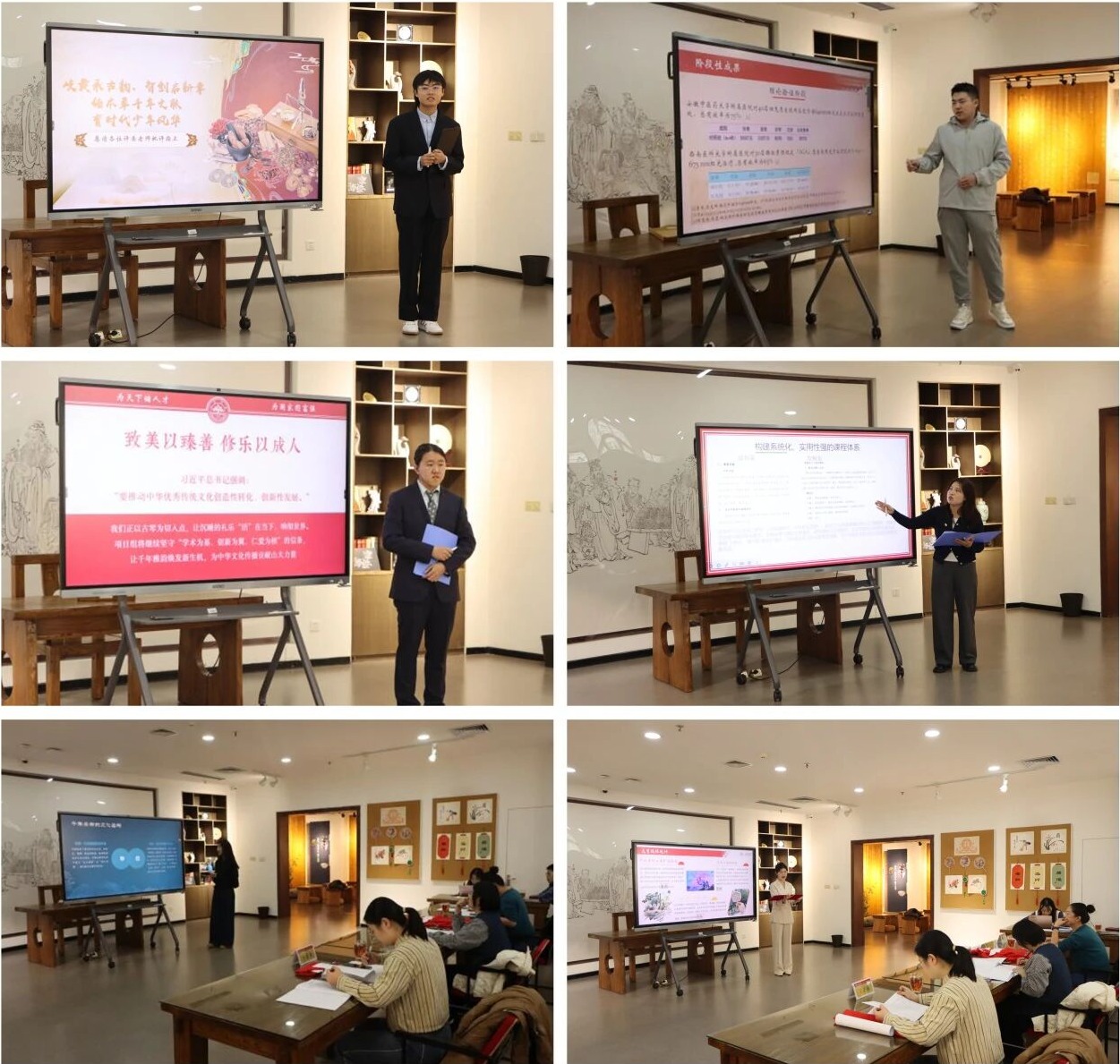 “礼乐传承:古琴教学与古乐复原”“熔古铸今:民族文化初探系列课程设计”“数智时代古文字传承与传播——‘鸟虫书’文创产品开发与研究”等12个项目参与了此次中期考核答辩。各项目主讲人围绕项目研发与实施情况、创新价值与特色、阶段性成果、预算执行情况等核心内容进行了汇报。项目团队通过图文展示、实物呈现、视频演示等多种形式,充分展现了山大学子在文化传承、数字赋能、跨界融合等方面的创新探索,彰显了青年学子投身中华文化创造性发展的青春风采。